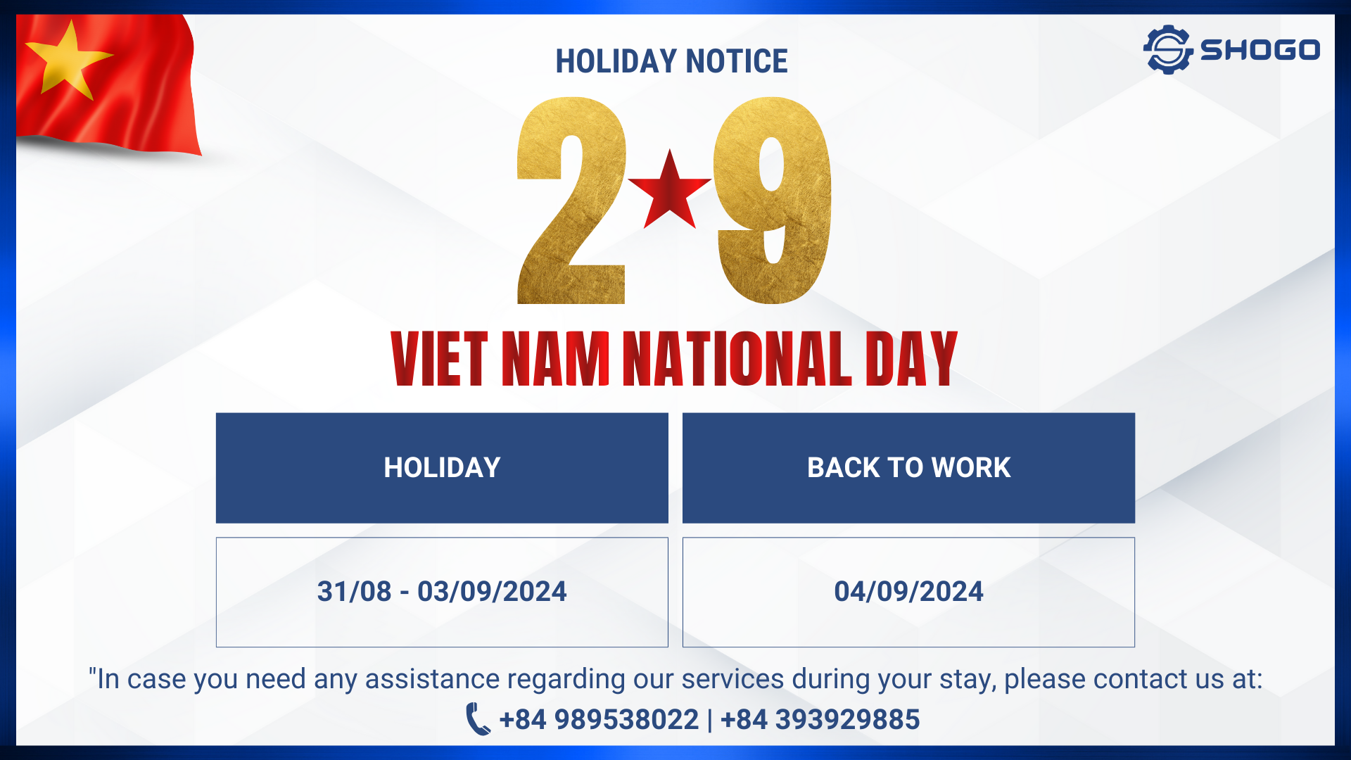 On the occasion of the 79th anniversary of the National Day of the Socialist Republic of Viet Nam (September 2, 1945 – September 2, 2024), SHOGO VIET NAM Company would like to respectfully announce the holiday schedule as follows: